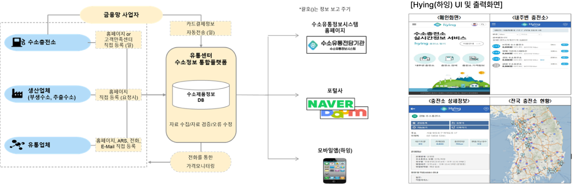 홈페이지, 수소유통정보시스템 Hying(하잉, App) 등을 통하여 수집된 충전소 정보 실시간 제공